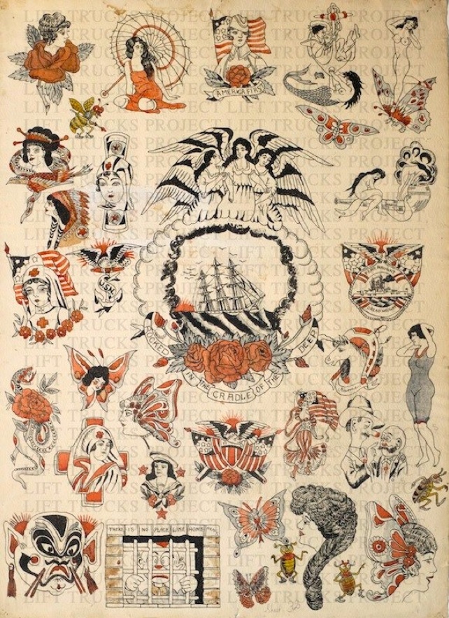 Original flash sheets from over two dozen artists who built American tattooing. Part of the Lift Trucks Art collection in Croton Falls, New York.