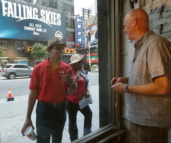 “A passerby stops to watch artist Tom Christopher, right, who, along with another artist, Andy Hammerstein, has set up a temporary studio in the Brill Building in Times Square in New York, Wednesday, July 9, 2014. The artists, who are known for their New York cityscapes, have been working on the pop installation six hours a day since June 17.”