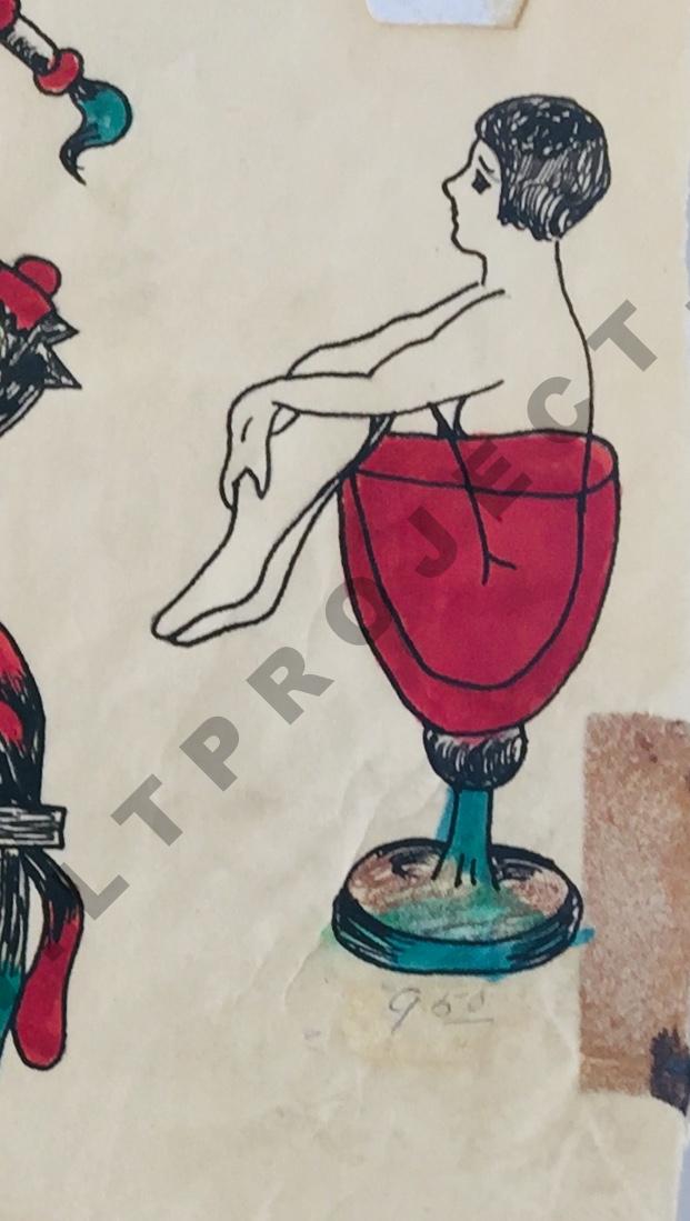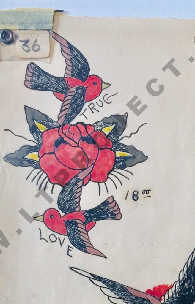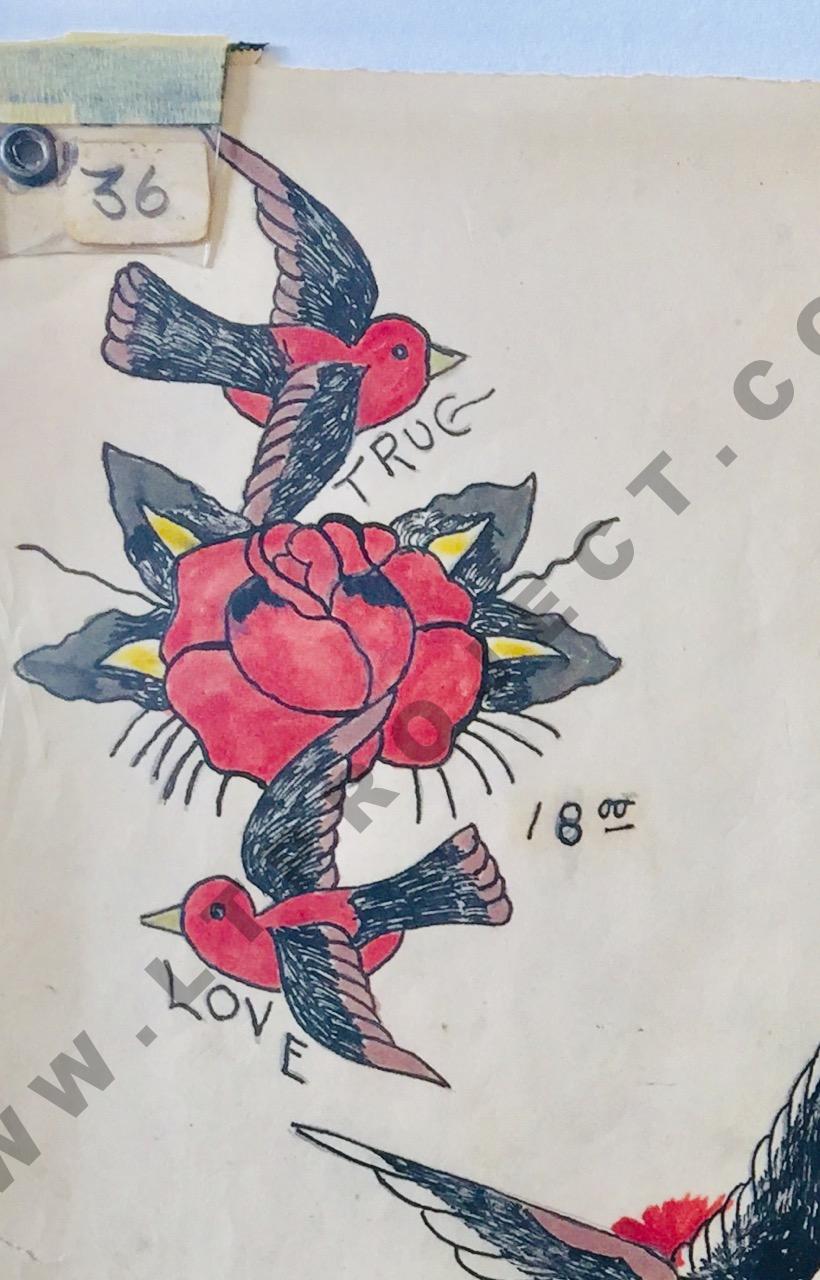 The two colored flash fragments, dated 1940, belong to a different category altogether. Their controlled outlines, standardized palette, and catalog-style numbering indicate production flash intended for parlor display. The seated woman in the wine glass reflects the influence of 1930s cabaret and novelty imagery entering tattoo culture between the wars, while the paired birds surrounding a rose and the words TRUE LOVE represent one of the most enduring motifs in American traditional tattooing—portable, symmetrical, and immediately legible from across a room.