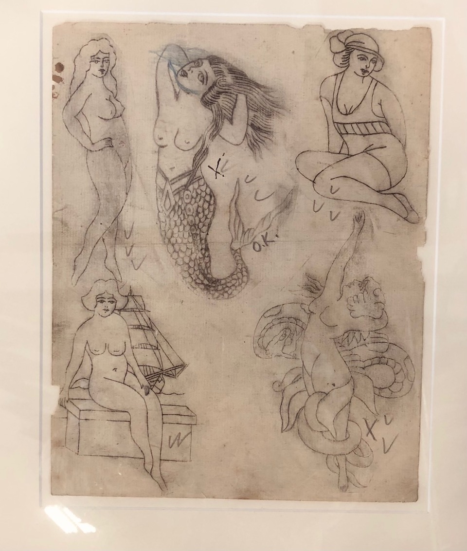 The graphite drawing sheet—centered around a mermaid marked “O.K.” and surrounded by bathing beauties, a seated nude beside a ship, and a serpent-entwined figure—reads less like finished flash and more like a working page from a tattooer’s sketchbook. The looseness of the line, uneven spacing between figures, and selection marks beside several images suggest designs being evaluated or repeated in use rather than prepared for display. Pages like this were tools. They lived on tables, not walls.